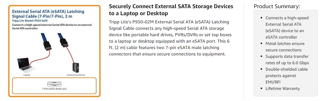 With data transfer speeds six times faster than USB 2.0 and Firewire (IEEE 1394), eSATA delivers much higher data rates as high as 6 Gbps—the same as traditional SATA, but in a smaller, more convenient external connection with devices like portable hard drives and laptops.