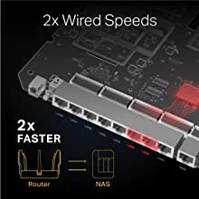 Team two LAN ports using Link Aggregation to double connection speeds from 1 Gbps to 2 Gbps for Network Attached Storage (NAS) devices and PCs. Combine the WAN port with a LAN port to connect DOCSIS 3.1 modems for best-in-industry internet speeds.