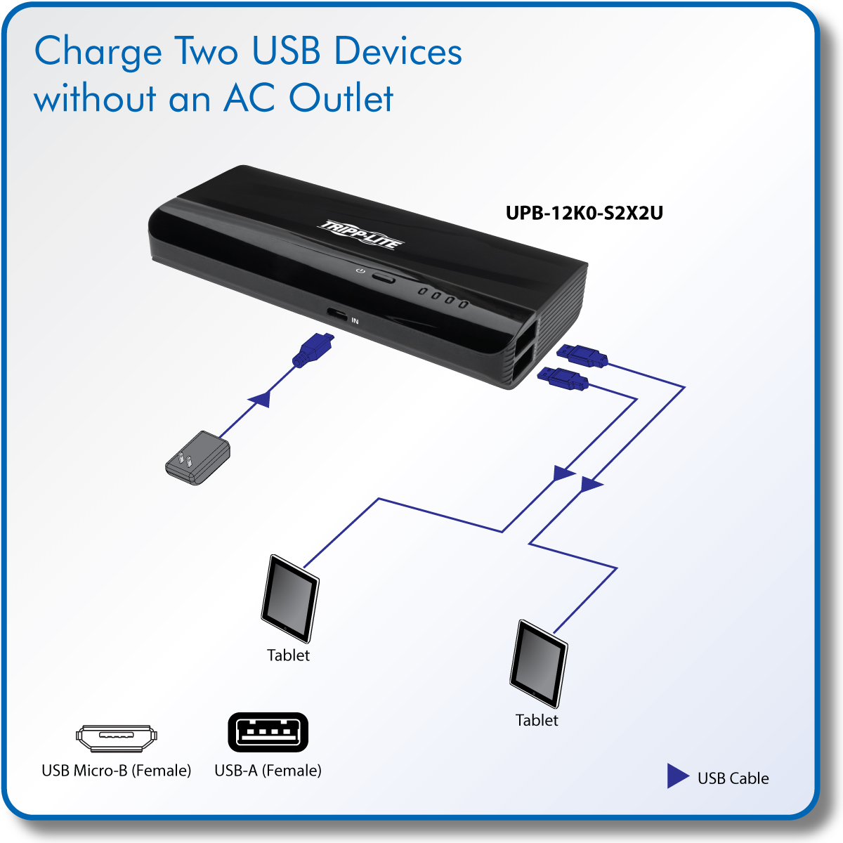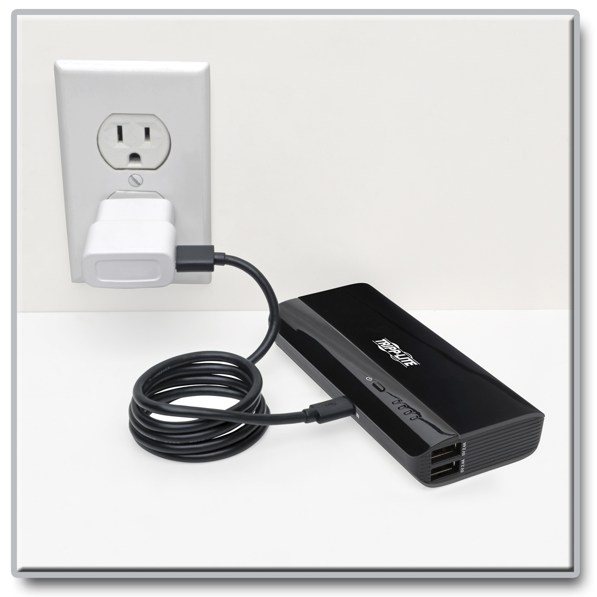 A lithium-ion battery with 12,000mAh of capacity provides charging at maximum power draw for hours, making your devices ready when you need them. Status LEDs let you know how much battery capacity is left. When it’s time to charge the internal battery, use the included Micro-B cable to connect the power bank’s Micro-B port to a USB-A port on a computer or wall charger.