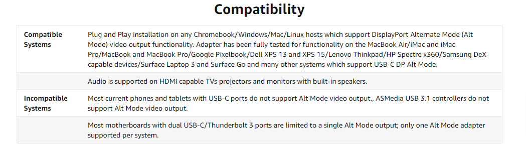 4K DisplayConnect your HDMI-equipped monitor, television or projector to your laptop or tablet and achieve resolutions up to 4K 30Hz (3840x2160 @ 30Hz) . Other popular supported resolutions include 3440x1440, 2560x1440, 1920x1200, 1920x1080, and lower. Note: This adapter will not work with DisplayPort monitors. |