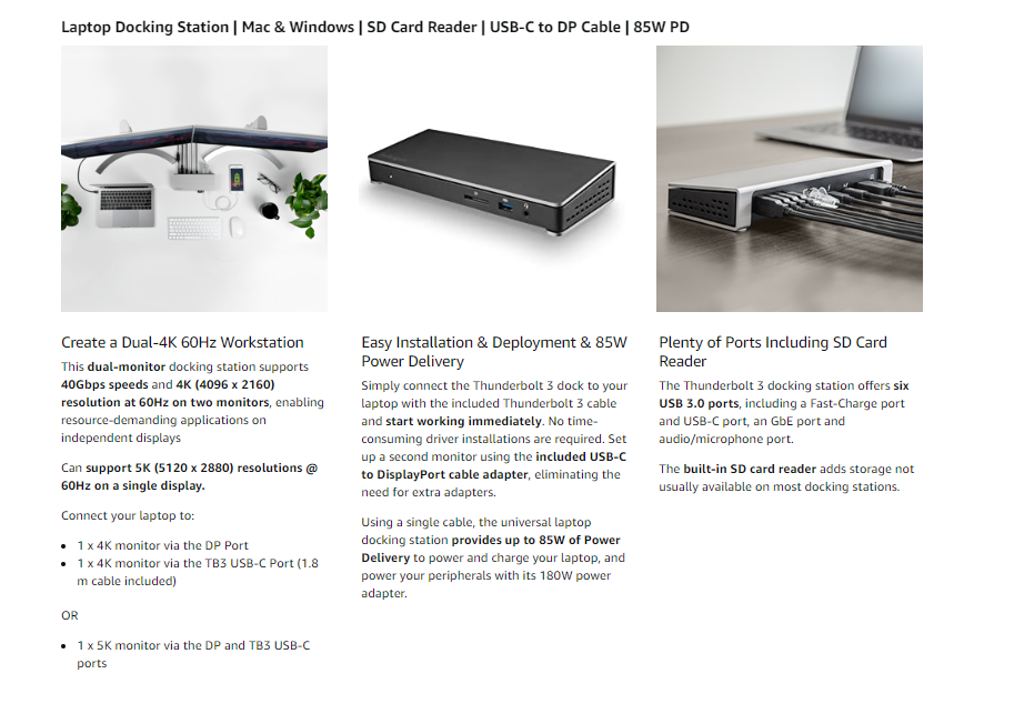 StarTech.com Thunderbolt 3 Dock - Dual Monitor 4K 60Hz TB3 Docking Station with DisplayPort - 85W Power Delivery, 6-Port USB 3.0, SD, GbE