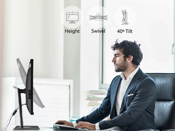 With advanced ergonomic features including swivel, pivot, height adjust, and tilt, this monitor is designed to provide a greater range of adjustment for increased productivity and comfort. The monitor can tilt up to 40-degrees, making it ideal for use during group discussions and screen sharing.