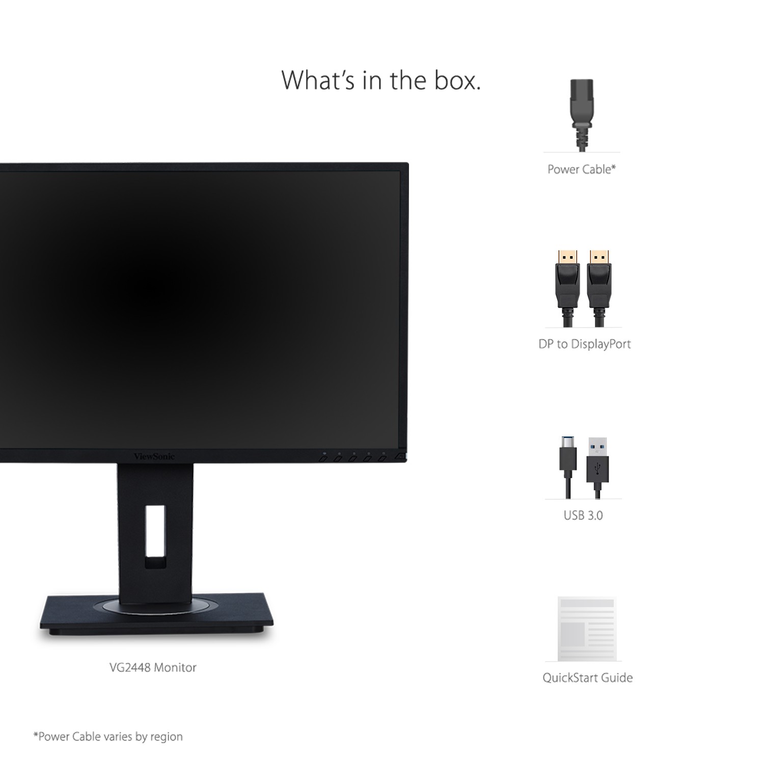 Designed for the modern day office, the ViewSonic ® VG2448 monitor delivers an efficient end-to-end enterprise experience. Featuring SuperClear ® IPS panel technology and 1080p resolution, this 24” (23.8” viewable) monitor delivers crisp and clear images from nearly any viewing angle. For enhanced productivity, an advanced ergonomic design offers a wide range of customizable adjustments for maximum comfort including pivot, swivel, height adjustment, and tilt. With the ability to tilt an impressive 40-degrees, the VG2448 is ideal for users who prefer to work while standing up, as well as for those who like to use their screen for group discussions. Versatile connectivity options include HDMI, DisplayPort, VGA, and USB. This monitor is also shipped in eco-friendly biodegradable packaging, along with an easy-to-install quick release stand that makes for simple out-of-the box setup. The quick release stand also includes an integrated client mount and cable management features, making this monitor perfect for deployment in cloud-based environments.