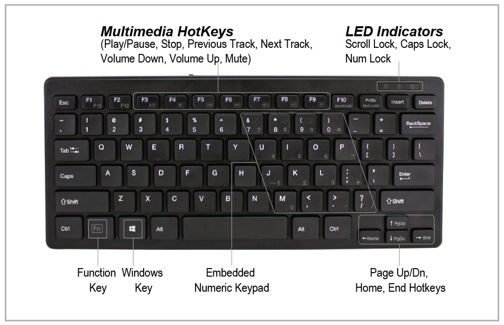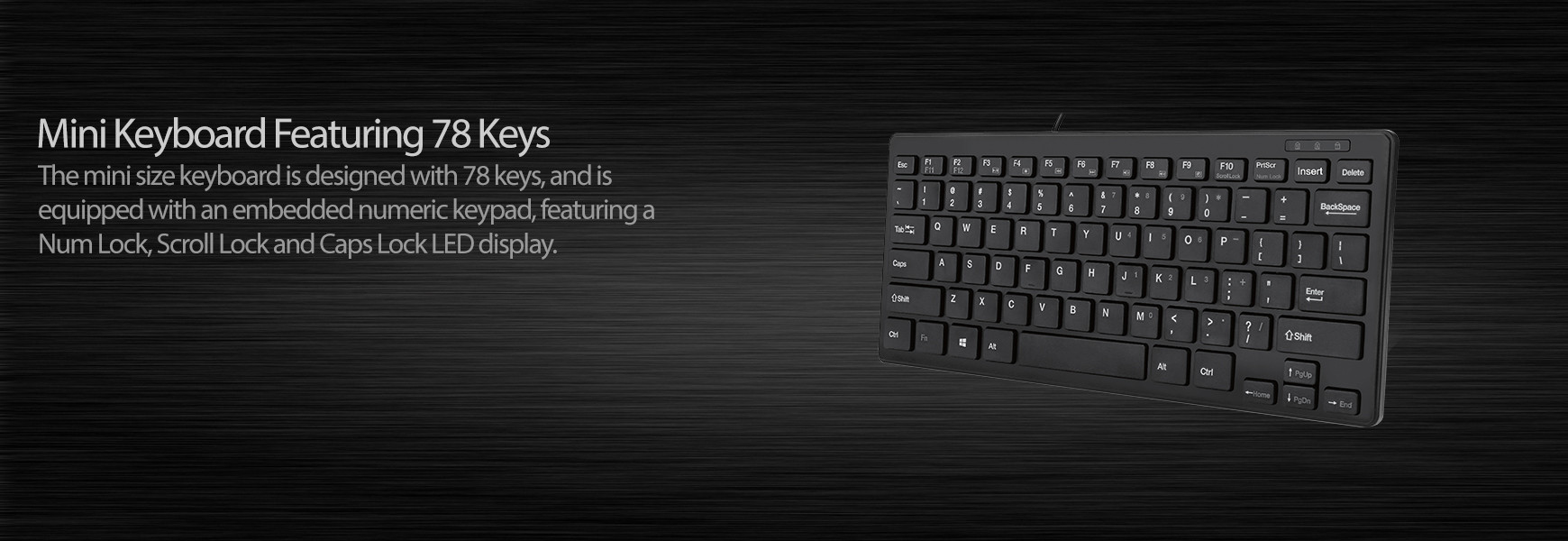 The mini size keyboard is designed with 78 keys, and is equipped with an embedded numeric keypad, featuring a Num Lock, Scroll Lock and Caps Lock LED display.