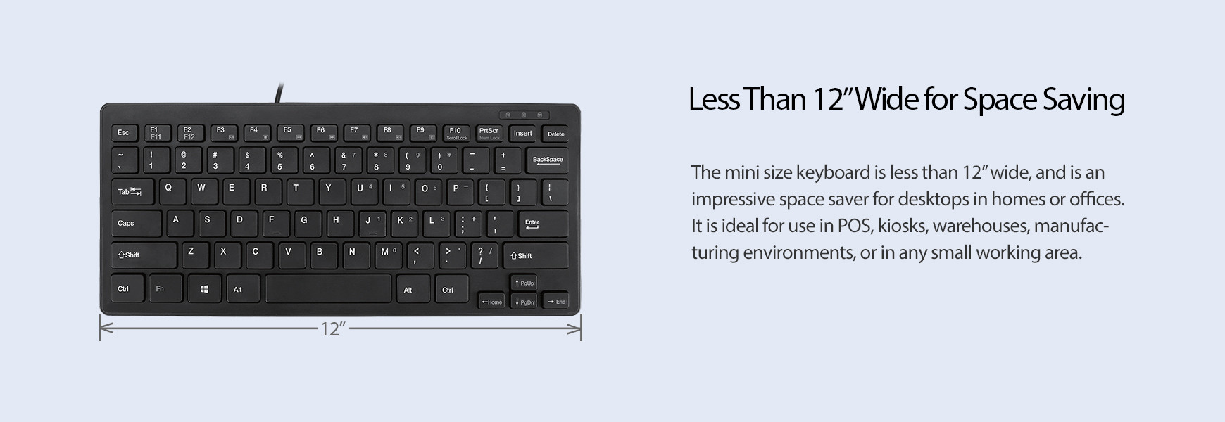 The mini size keyboard is less than 12” wide, and is an impressive space saver for desktops in homes or offices. It is ideal for use in POS, kiosks, warehouses, manufacturing environments, or in any small working area.