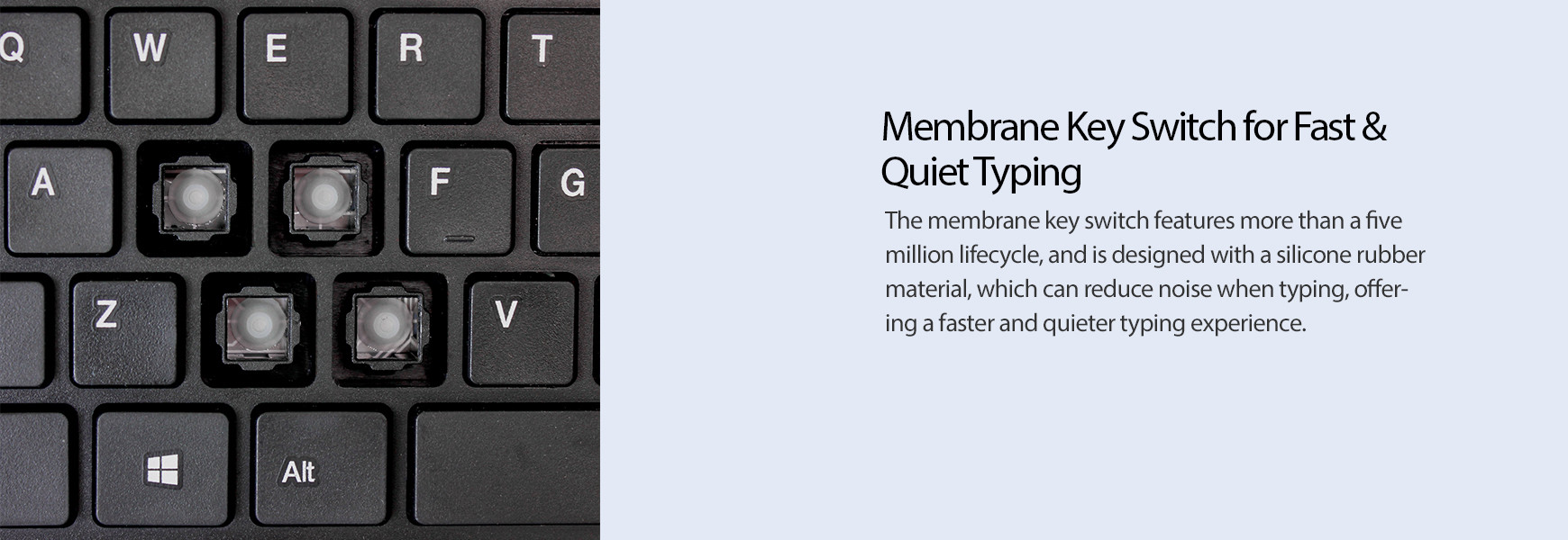 The membrane key switch features more than a five million lifecycle, and is designed with a silicone rubber material, which can reduce noise when typing, offering a faster and quieter typing experience.