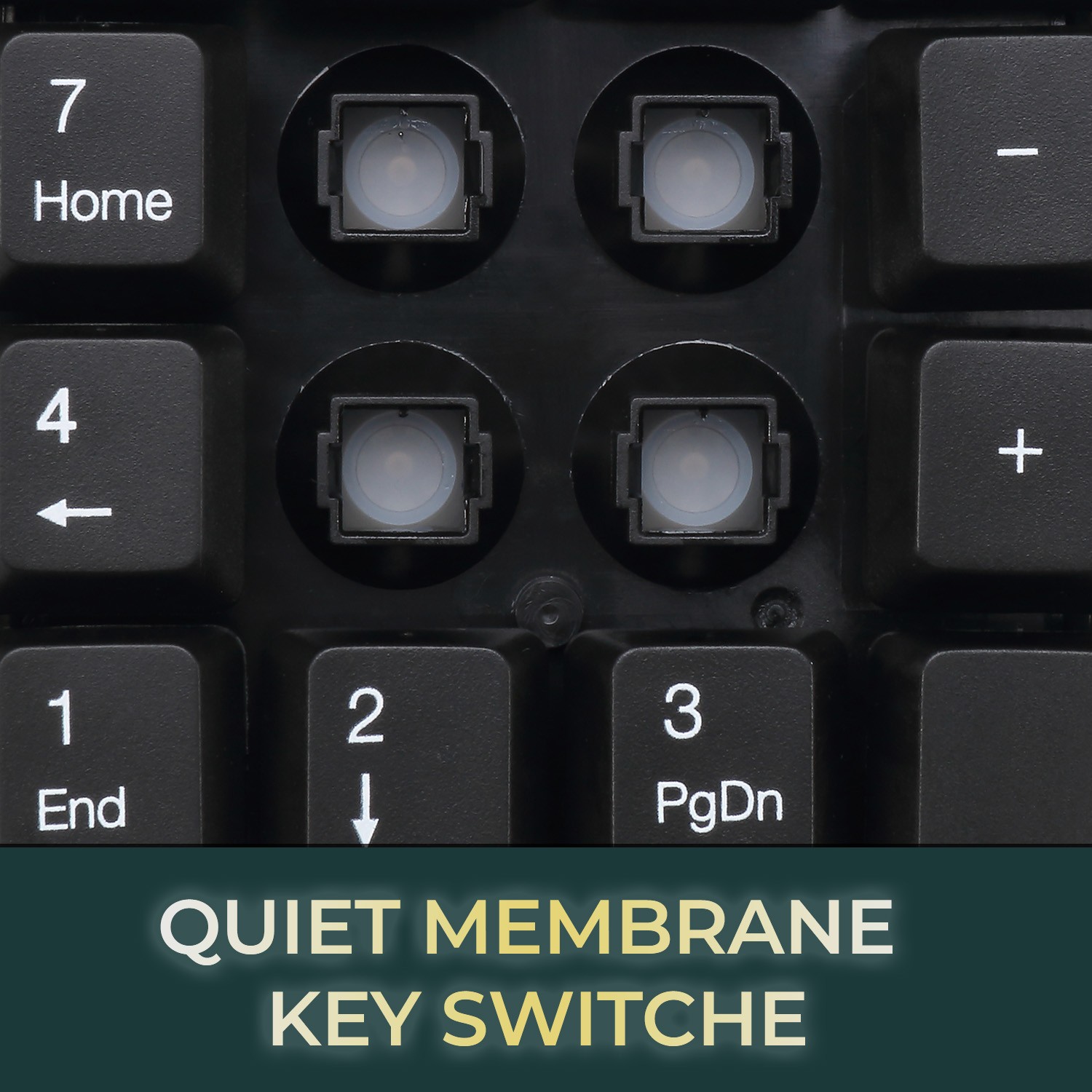 Membrane key switches provide a quieter typing experience with lifecycle lasting up to five million keystrokes.