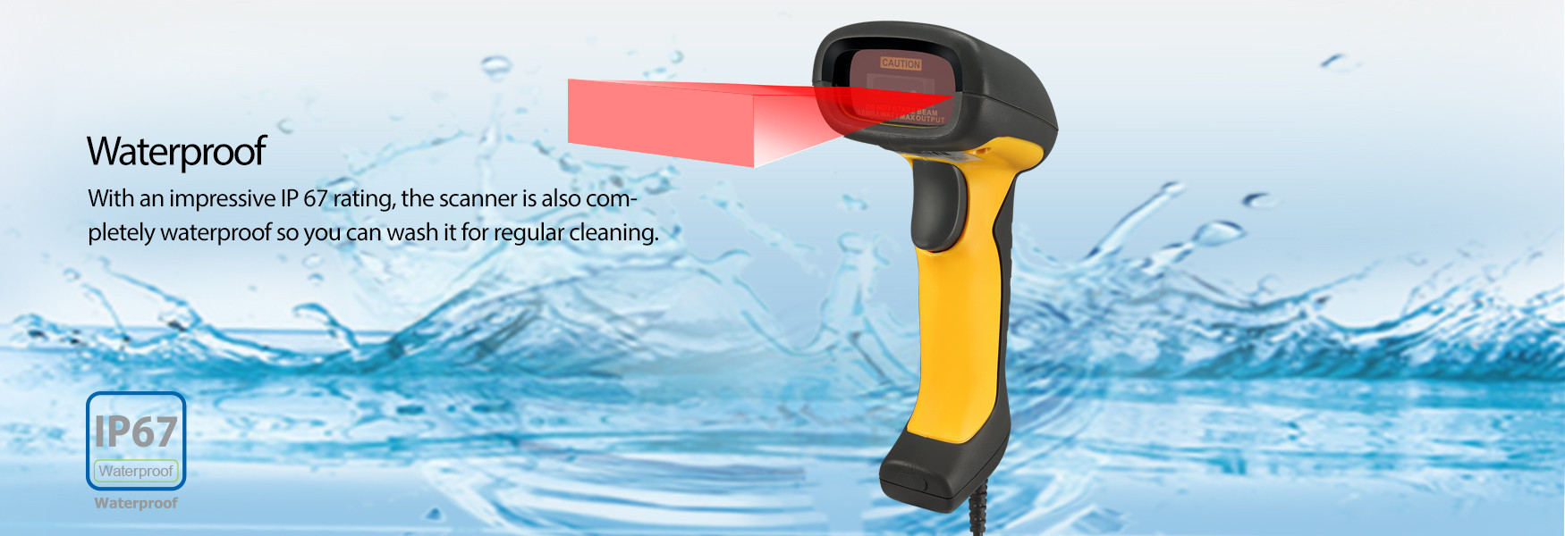 IP67 Rated. Sealed with a silicone plastic material, this scanner is 100% waterproof and can be cleaned with soap and water or other liquids cleaners. Ranked as a IP67 Waterproof Standard, this device can withstand being submerged in water for up to 30 min up to a depth of 3 feet.
