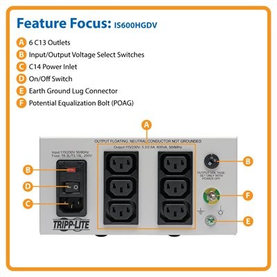 At 600 watts, the IS600HGDV can handle a variety of essential devices. Selectable 115V/230V input/output voltage with step-up, step-down or pass-through operation is also suitable for a wide range of devices and facilities. A 240-joule surge protection rating suppresses excess voltage to prevent it from damaging connected equipment (the unit automatically shuts down all outlets in case of overload). Transformer filtering provides continuous common-mode EMI/RFI line noise rejection with no wearable parts. The IS600HGDV reduces 6000V IEEE 587 Category A and B ring wave and combination wave test surges to only 0.5V common mode.