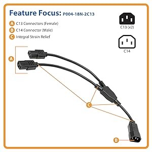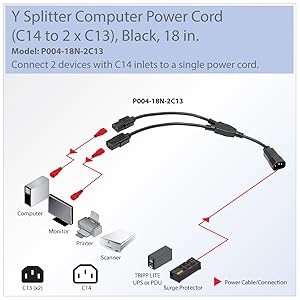 Tripp Lite’s P004-18N-2C13 Y-style splitter cord allows two devices with C14 power inlets to share one AC input cord and one C13 outlet. The UL-listed power cord features a C14 end for connecting to an AC power source on a PDU, surge protector or UPS system and two C13 ends for connecting to devices. By connecting two devices to one outlet in your home office or workspace, the power cord splitter frees up space in a PDU or surge protector and helps reduce cable clutter.