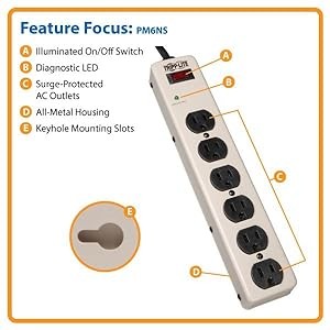 With Waber-by-Tripp Lite’s PM6NS Commercial-Grade Surge Protector, you’ll have reliable, protected outlets where you need them, even in the harshest work environments. Featuring six standard outlets, a 6 feet cord, surge protection and a metal housing, the PM6NS is ideal for high-traffic commercial and industrial applications and other harsh environments.