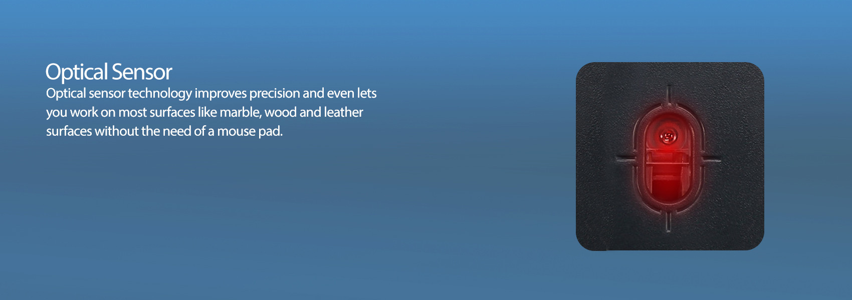 Optical sensor technology improves precision and even lets you work on most surfaces like marble, wood and leather surfaces without the need of a mouse pad.