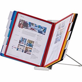 The InstaView Desktop Reference System from Durable is economical, functional, and an ideal organizational tool for customer service, sales, and general office use. It is easily expandable by connecting additional systems with each other (connectors included) and features glare-free polypropylene sleeves with rugged black frames. Also available with frames in assorted colors - two each in red, black, yellow, blue, and green (DBL5612-00). Includes desk stand, 10 sleeves (20 viewing sides) and 5 snap-on tabs.