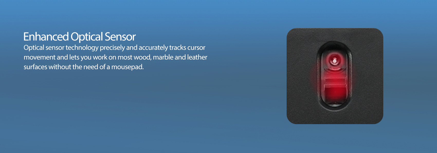 Optical sensor technology precisely and accurately tracks cursor movement and lets you work on most wood, marble and leather surfaces without the need of a mousepad.