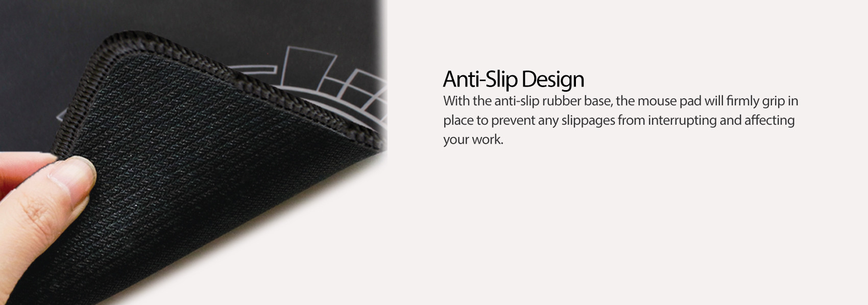 With the anti-slip rubber base, the mouse pad will firmly grip in place to prevent any slippages from interrupting and affecting your work.