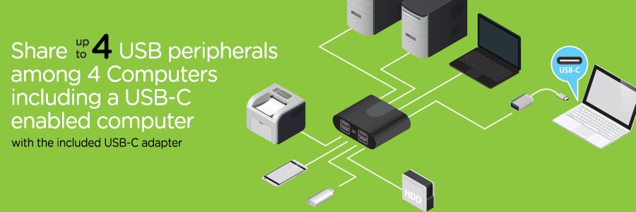 Connect and share up to four USB 2.0 peripherals with four computers including your new USB-C computer. Attach a keyboard, mouse, printer, portable hard drive or other USB device and switch between laptops and desktops with the push of a button. Add your USB-C computer to the mix and share your existing USB peripherals via the included USB-C adapter.