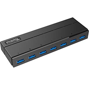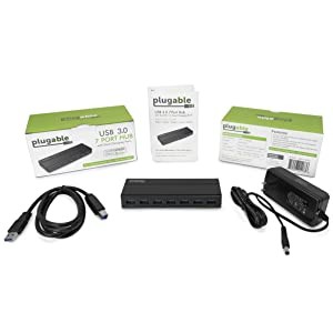 The Plugable 7-Port USB 3.0 Hub with 36W Power Adapter (USB3-HUB7C) expands USB connectivity by enabling up to seven USB 3.0, 2.0 and 1.1 devices to be added to any USB 3.0 or 2.0 capable desktop, laptop, or tablet computer. Supporting standard USB 3.0 transfer rates up to 5Gbps (640MBps) to allow data to move quickly between devices, ideal for high-throughput devices such as USB external hard drives, flash drives, and USB graphics adapters.
