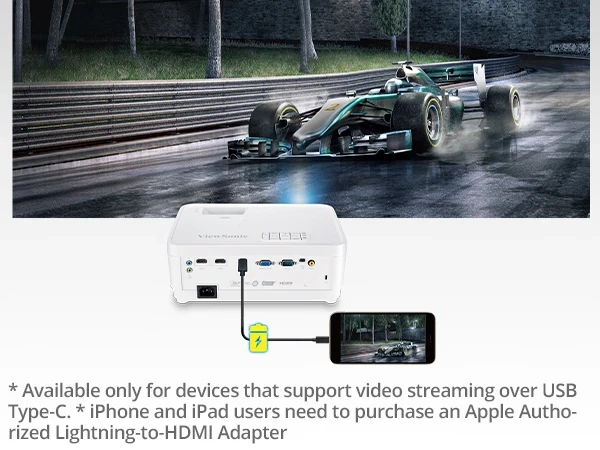 *The projector's power adapter must be plugged in for USB Type-C charging. When the projector is not plugged in and operating on battery power alone, it can still play content from a mobile device connected via USB Type-C, but it cannot charge the mobile device. Please ensure the host device supports video transmission.
