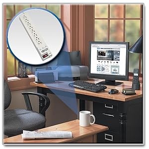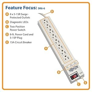 It could happen in the blink of the eye: a sudden power surge that damages or destroys your valuable components. In one cost-effective unit, the SK6-6 provides 1080 joules of reliable surge protection to eight AC outlets. Included child safety covers keep unused outlets safe and color-coded cord identifiers take the guesswork out figuring out which component is plugged into an outlet. A long 8-feet cord allows connection to distant outlets and the space-saving, right-angle plug allows furniture and other items to be placed closer to the wall.