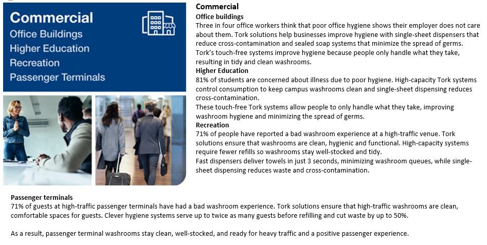 71% of guests at high-traffic commercial washrooms have a negative experience. Tork's solutions are hygienic, attractive and easy for guests to use. High-capacity systems serve twice as many guests per refill, making it easier to keep washrooms well-stocked. Features like compressed refills and Easy Handling™ packaging increase efficiency, so staff have more time for cleaning.