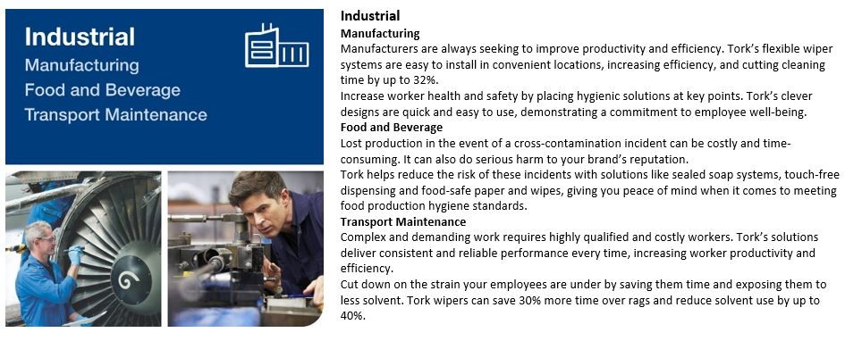 Efficiency is a constant challenge for the industrial sector, where LEAN methodology is becoming increasingly important. Flexible installation means you can mount Tork industrial wiping systems at convenient locations, saving workers fetch and search time. Tork products support 5S principles, helping you shine, standardise and sustain. Tork solutions promote good employee hygiene practices, showing workers their wellbeing is valued and helping to prevent absences.