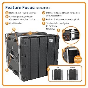 The SRCASE10U supports up to 10U of EIA-standard 19-inch equipment with a maximum depth of 20.5 inches. Its load capacity is 150 lb. Included mounting hardware simplifies placement of equipment, and a zippered pouch in one cover stores cables and accessories without taking up extra space.