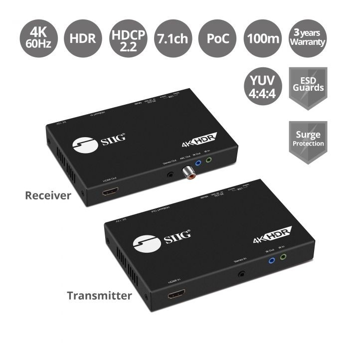 Extends HDMI 2.0 audio and video signal from your HDMI source to a remote HDMI display up to 330ft (100m) away at Full HD 1080p, or 230ft (70m) at 3840x2160@60Hz (4:4:4 8bit/HDR10 4:2:0 10bit) through a single premium quality CAT5e/6 cable