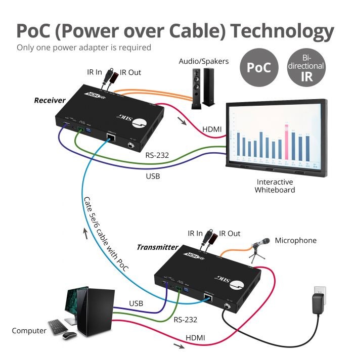 Supports PoC (Power over Cable) technology which allows both the transmitter and receiver units to be powered through only one power adapter