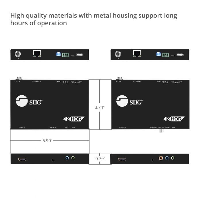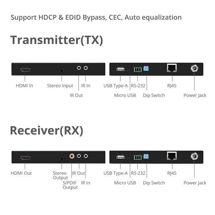 Extends HDMI audio and video signals, USB 2.0, RS232 control, IR control up to 100 meters over a single CAT5e/6 cable with industry recognized HDBaseT technolog