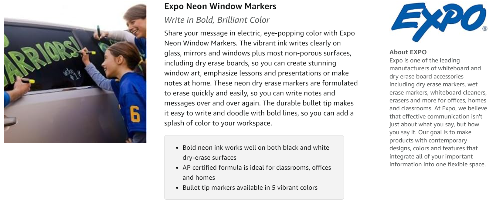 Add a splash of bold color to windows, glass materials, whiteboards and other surfaces with Expo Neon Window Markers, which allow you to write on both black and white surfaces for eye-catching color and detail.