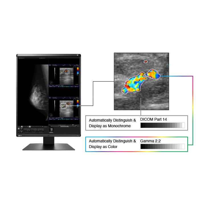 Optimum Breast Screening MonitorThe monitor has obtained FDA 510(k) clearance by the U.S. Food and Drug Administration for breast tomosynthesis and mammography. This ensures that the monitor is capable of displaying detailed breast screening images where high performance is essential.Display Both Monochrome and ColorThe Hybrid Gamma PXL function automatically distinguishes between monochrome and color images pixel by pixel, creating a hybrid display where each pixel has optimum grayscale; giving it greater accuracy and reliability than the conventional area-detection method.In addition to breast tomosynthesis and mammography monochrome images, which require high display performance, the RX560 also faithfully reproduces color images such as breast MRI and CT, ultrasound, and pathology. This ultimately improves efficiency by allowing both monochrome and color images to be viewed on one screen.Smooth Display of Breast TomosynthesisThe monitor has a response time of 12 milliseconds, making it ideal for enlarging and panning medical images, as well as quickly displaying 3D breast tomosynthesis which comprises of several images in each shot.