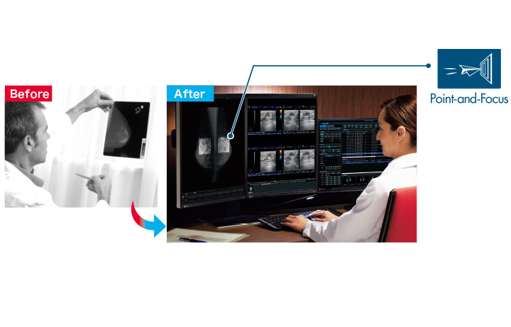 Evolve Your Image Reading As more image modalities become digitalized, radiologists are viewing an increasing amount of information on their screens. EIZO's unique Work-and-Flow technology alleviates the complexity of the imaging workflow with new functions developed with the radiologist in mind. Users can take advantage of Work-and-Flow features with the RadiForce monitor and bundled RadiCS LE software. Quick and Easy Focus With the Point-and-Focus function, you can quickly select and focus areas of your concern with just your mouse and keyboard. Change the brightness and grayscale tones of certain points on the screen to make interpretation easier.