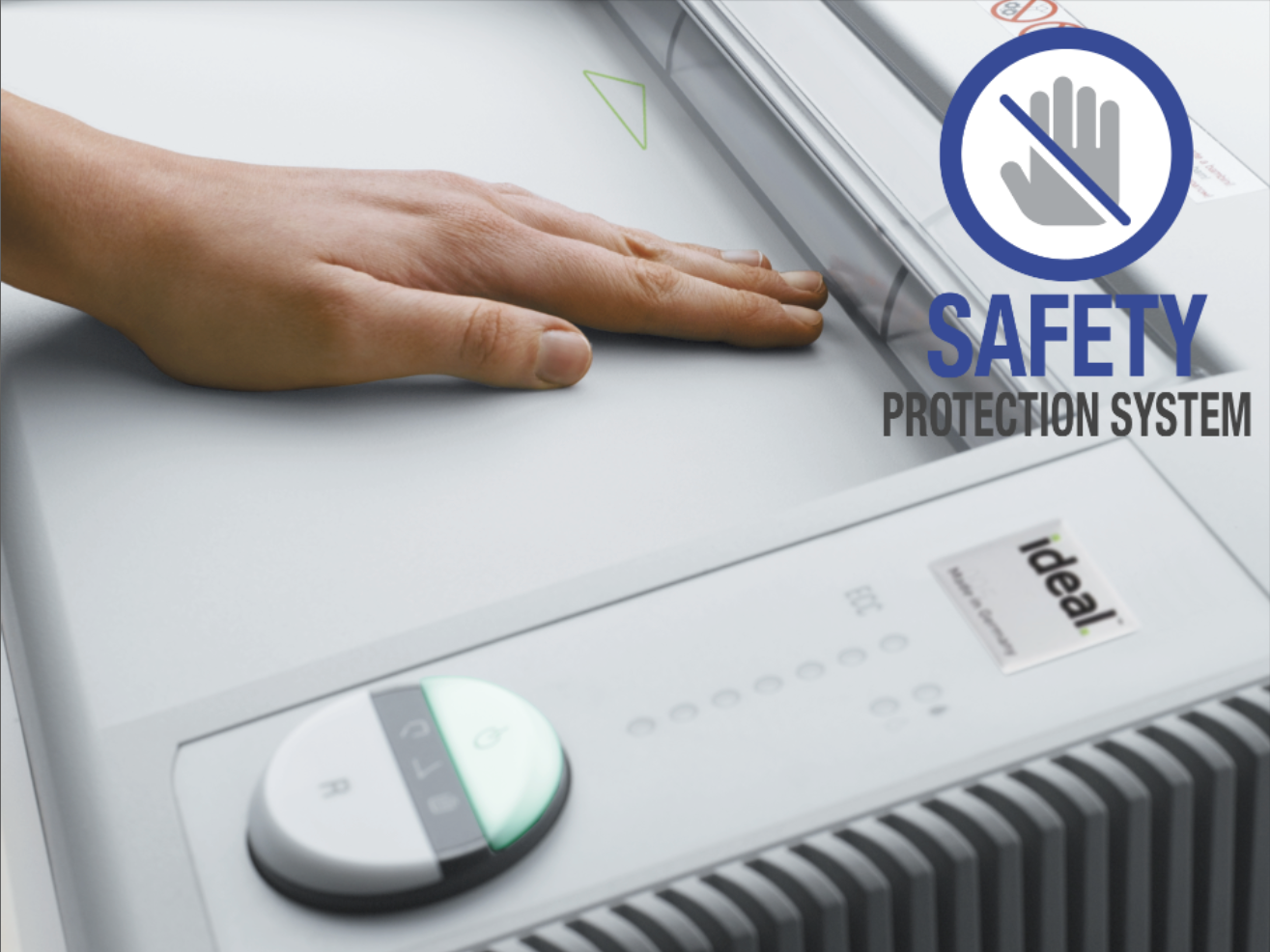 The Safety Protection System (SPS) package includes patented, electronic controlled, transparent safety shield in the feed opening; an electronic switch that stops power to the motor when the cabinet is opened or the shred bin is full; automatic reverse and power cut-off when overfed; and safeguards against overheating.