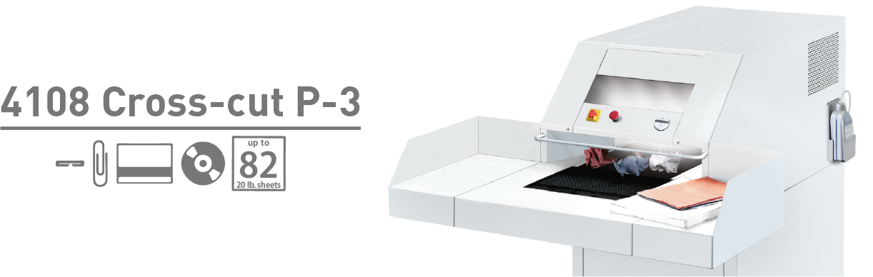 The ideal 4108cross-cut P-3 is a, hardworking, high capacity shredder, comes equipped with a16” feed opening, wide feed table, powered conveyor, and centralized oiler.Provides continuous, fast, and efficient shredding of paper, staples,paperclips, credit cards, CD/DVDs,