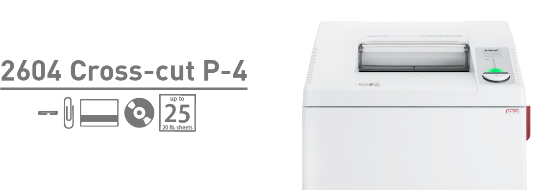 The ideal 2604cross-cut P-4 is a compact, hardworking, entry-level centralized shredder,designed for shredding paper, staples, paper clips, credit cards, CD/DVDs. It’sHIPAA and FACTA compliant, and federally accepted to protect information andsocial security numbers against identity theft.