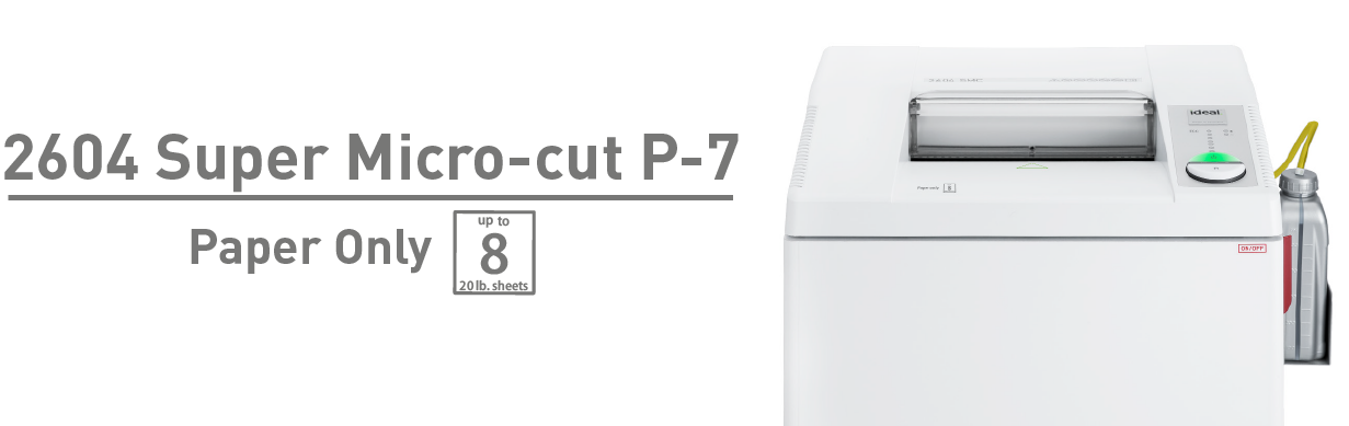 The ideal 2604super micro-cut P-7, is a convenient, and powerful deskside shredder designedfor shredding classified, and top-secret documents such as documents involvingCommunications Security (COMSEC), Secure Compartmentalized Information (SCI),and Special Access Programs (SAP).