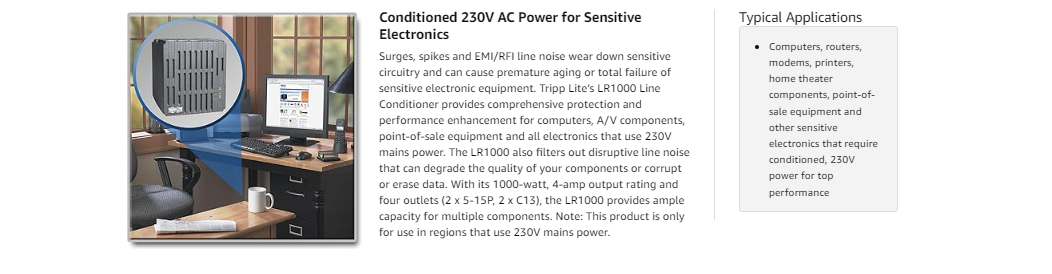 Various electromagnetic and radio sources can cause disruptive interference on the AC line. This EMI/RFI line noise is a common cause of incremental hardware damage, data corruption and audio/video performance problems. The LR1000 incorporates technology that filters out disruptive line noise so that equipment performs at its peak.