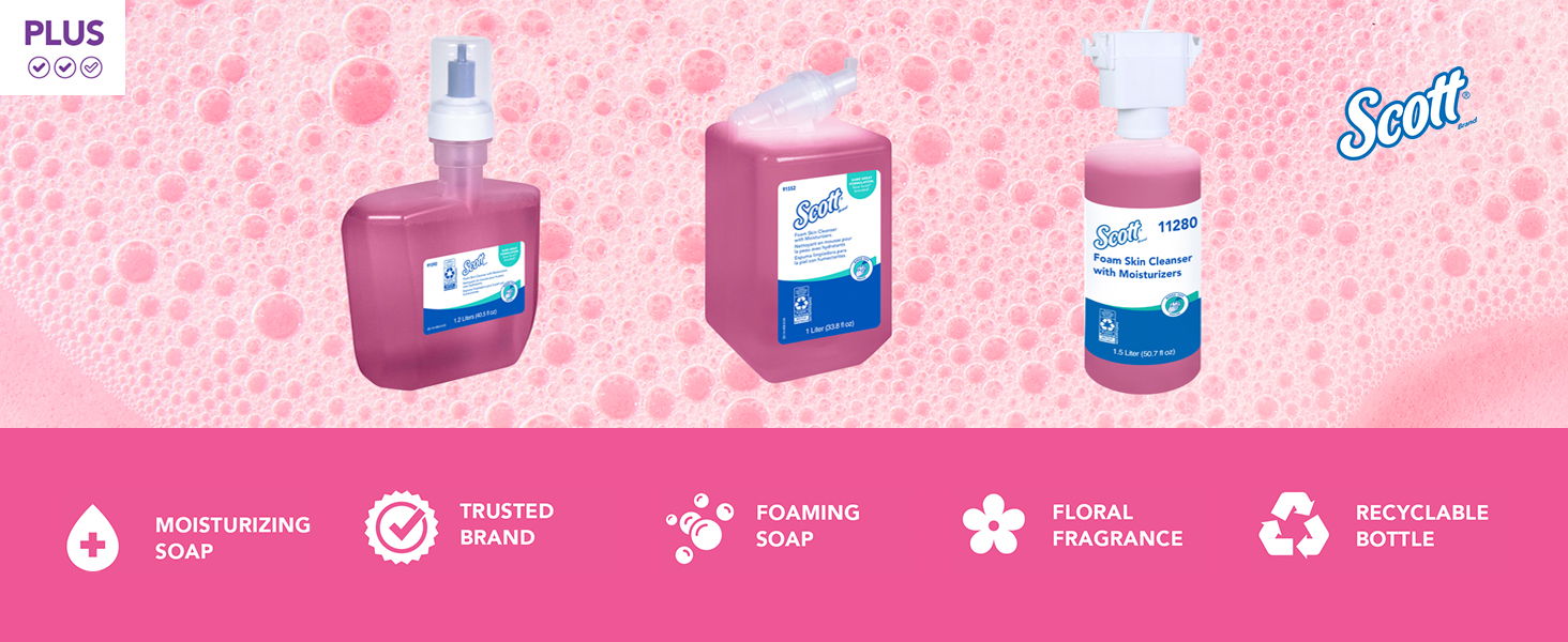 Scott® is one of the world’s most recognized restroom brands with over 150 years of experience keeping your staff and guests healthy. Show you care by providing Scott® Foam Hand Soap with Moisturizers, a preferred soap dispenser refill that helps to stop the spread of germs and offers a superior hand hygiene experience. This pink Scott® brand foaming hand soap features a subtle floral scent and is enhanced with soothing moisturizers to leave hands feeling refreshed. Because the coordinating dispenser is high-capacity, Scott® hand soap refills are a popular choice for use in washrooms in offices and stores, as well as hotels, schools, and more. When you're charged with maintaining restrooms in busy environments, Scott® soap dispenser refills maximize your productivity, while ensuring staff and guests at your facility stay clean and healthy.