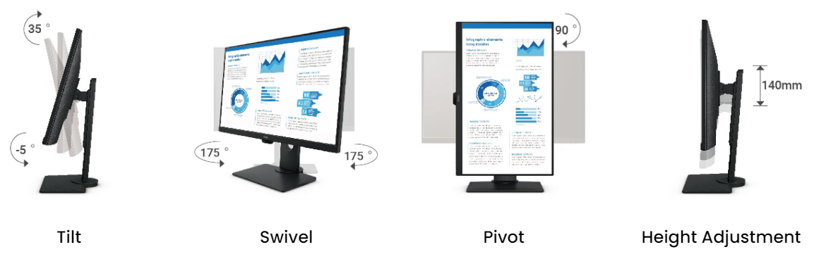 Easily enjoy all images in their full context by customizing the height, tilt, pivot, stroke and swivel of the monitor.