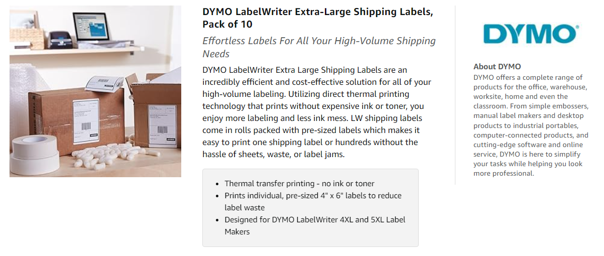Designed for the DYMO LabelWriter 4XL and 5XL, our fastest and most efficient label maker, DYMO LW Extra-Large shipping labels are the ideal solution for heavy volume and high impact labeling and come in a convenient 10-pack for efficiency.