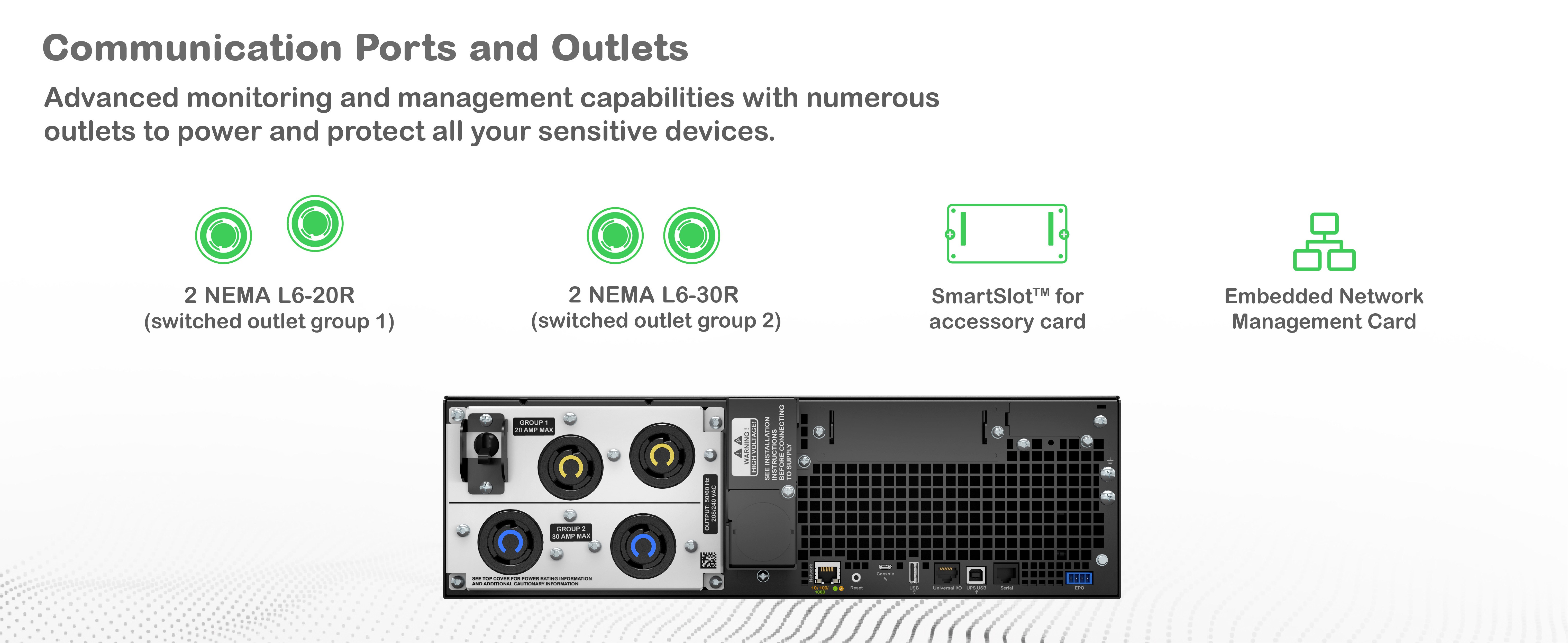 4 outlets in 3U (2) NEMA L6-20R, (2) NEMA L6-30R , including 2 switched outlet groups |