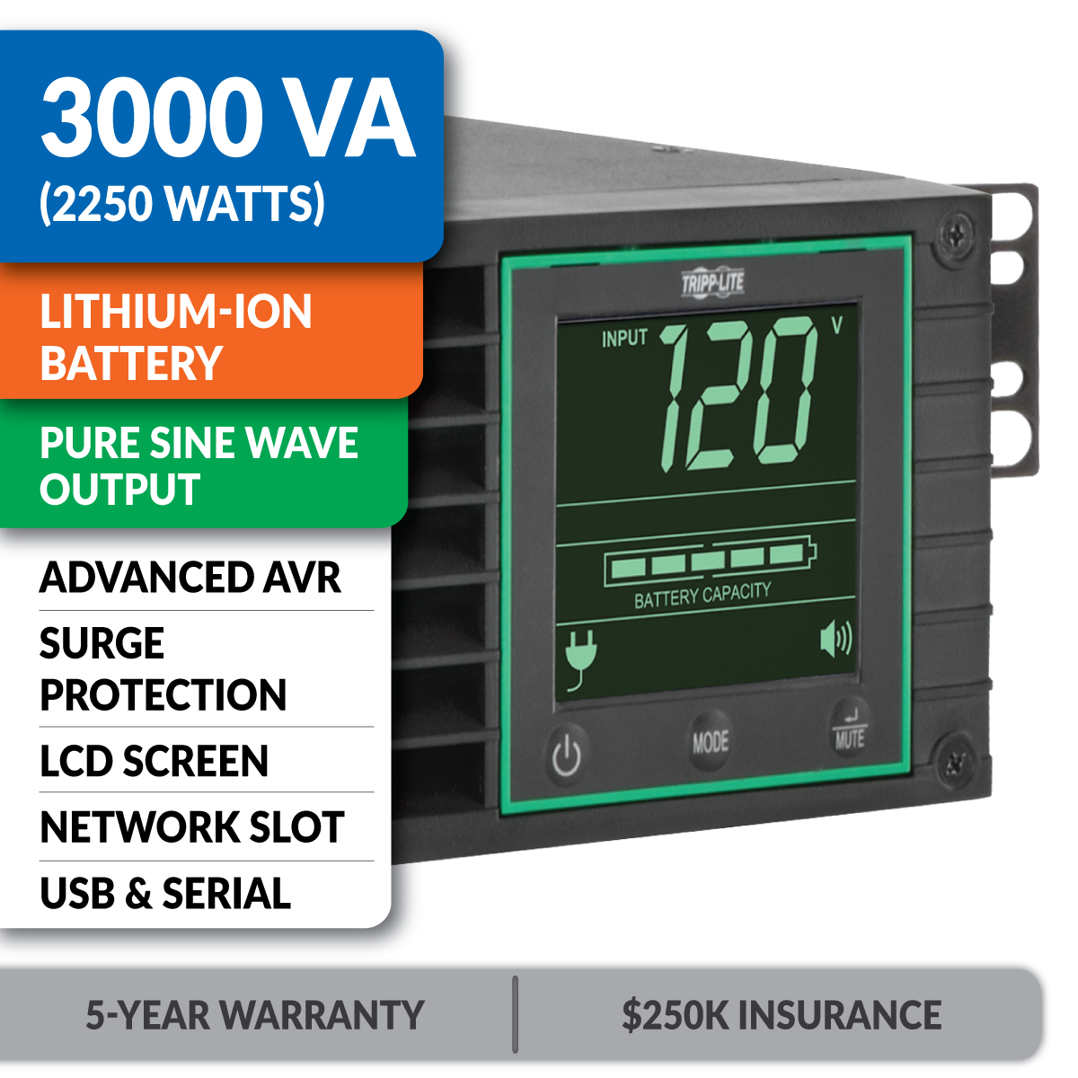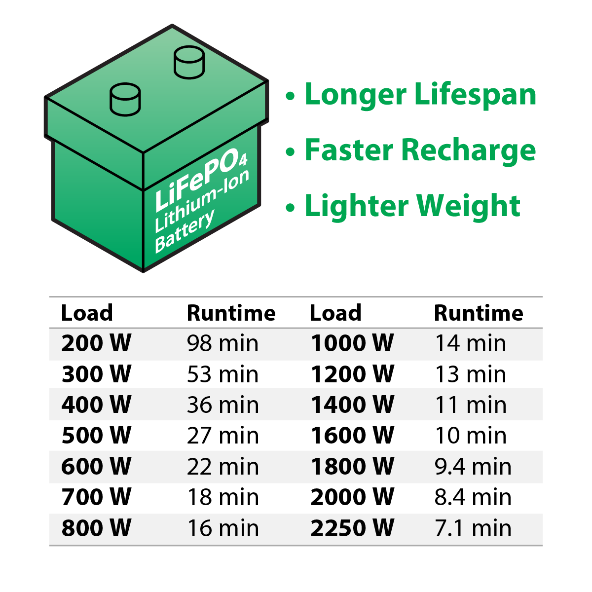 This UPS system also has a lithium-ion battery. The lithium-ion battery has a longer service life and recharges faster than a comparable lead-acid battery.