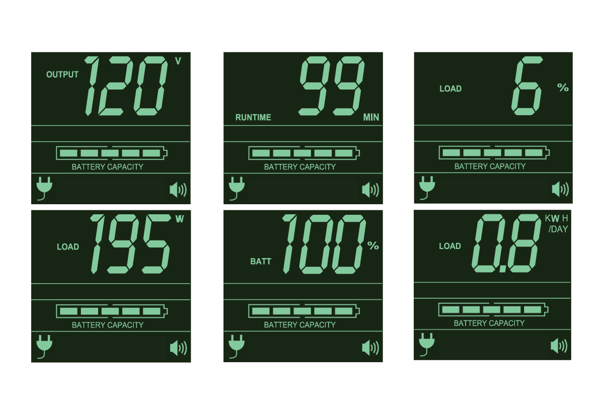 The illuminated LCD provides easy access to detailed UPS settings and information. The LCD shows a variety of helpful data, including input/output voltage, output load percentage, output load wattage, power status, battery status, AVR status, battery capacity, estimated backup runtime remaining and daily power consumption. If you decide to install the UPS system in a tower configuration, you can rotate the LCD for optimal viewing.