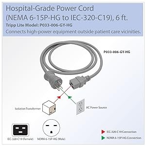Tripp Lite’s P033-006-GY-HG Hospital-Grade Power Cord features a C19 receptacle on one end and NEMA 6-15P-HG plug on the other, allowing you to connect a high-current medical device with a C20 inlet, like a server, isolation transformer or power strip, to a hospital-grade power source outside of a patient care vicinity. Its 6 ft. length allows some flexibility in placing your equipment, while its 14 AWG wire makes it suitable for devices that require a higher-gauge cable. It’s the perfect replacement for a worn-out power cord and can be used to extend an existing connection so a power source is easier to reach.
