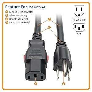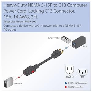 Tripp Lite’s P007-L02 computer power supply cable features 14 AWG wire suitable for high power connections, making it a reliable solution for large server applications that require a higher-rated, heavier-gauge cable. You can use it to connect a computer, server, monitor, laser printer or drive to a PDU, UPS, surge protector or AC wall outlet. It can also replace or upgrade the standard power cord provided by the device’s manufacturer. The two-foot length helps reduce cable clutter and minimize the risk of tripping.