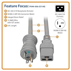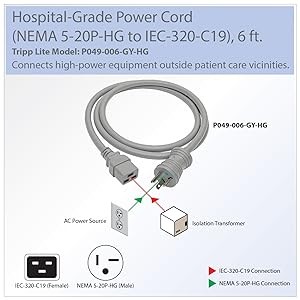 Tripp Lite’s P049-006-GY-HG Hospital-Grade Power Cord features a C19 receptacle on one end and NEMA 5-20P-HG plug on the other, allowing you to connect a high-current medical device with a C20 inlet, like a server, isolation transformer or power strip, to a hospital-grade power source outside of a patient care vicinity. Its 6 ft. length allows some flexibility in placing your equipment, while its 12 AWG wire makes it suitable for devices that require a higher-gauge cable. It’s the perfect replacement for a worn-out power cord and can be used to extend an existing connection so a power source is easier to reach.