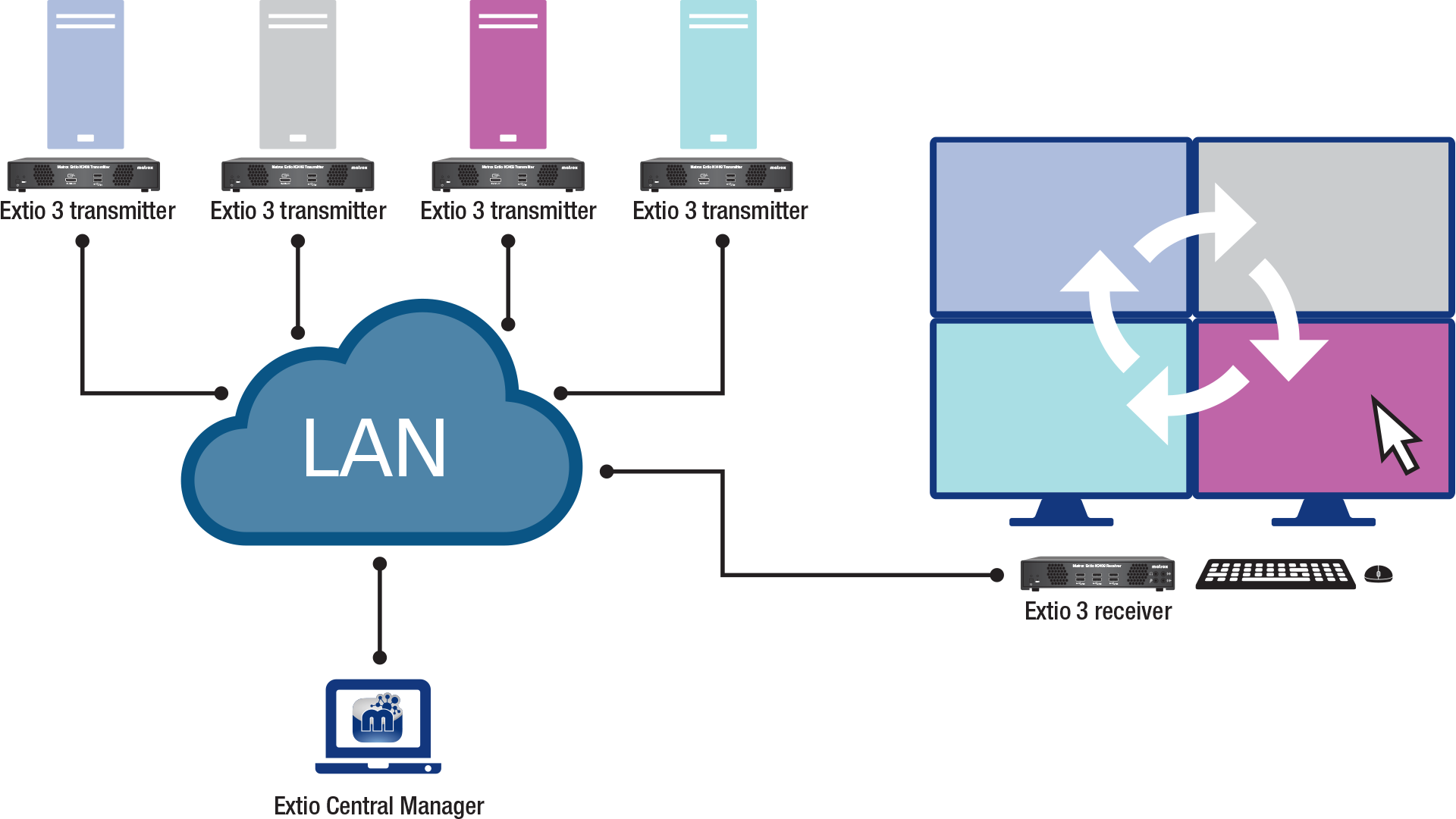 Extio Central Manager is an intuitive, easy-to-use software to remotely configure, manage, and monitor all Extio 3 units from a central location on the network. An on-screen display (OSD) on Extio 3 receiver appliances allow operators to conveniently preview all authorized computer desktops—readily identifiable via thumbnail previews—to instantly access and switch between multiple systems.