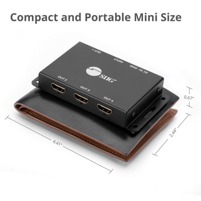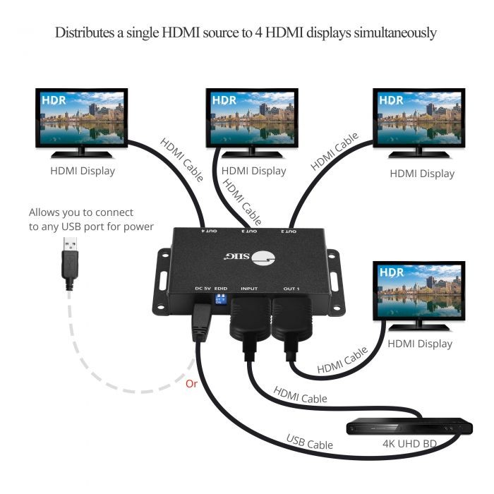 Distributes HDMI video and audio from a single source to up to 4 HDMI displays simultaneously while maintaining signal quality