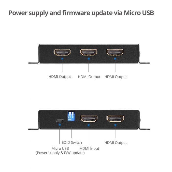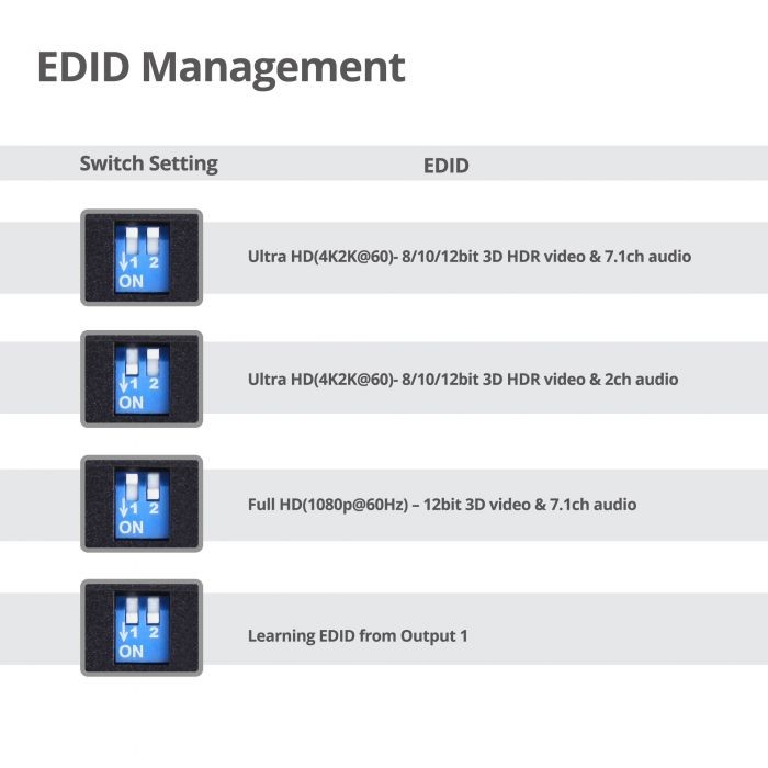 EDID and firmware management feature for maximum compatibility now and into the future, offers widest range of monitor/display/TV support from either pre-programmed EDID or EDID learning from the connected displays. Firmware upgradeable (via Mini USB port) for expanded compatibility