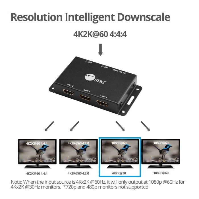 Resolution downscaling feature detects and configures the video resolution automatically according to the capabilities of each connected monitor